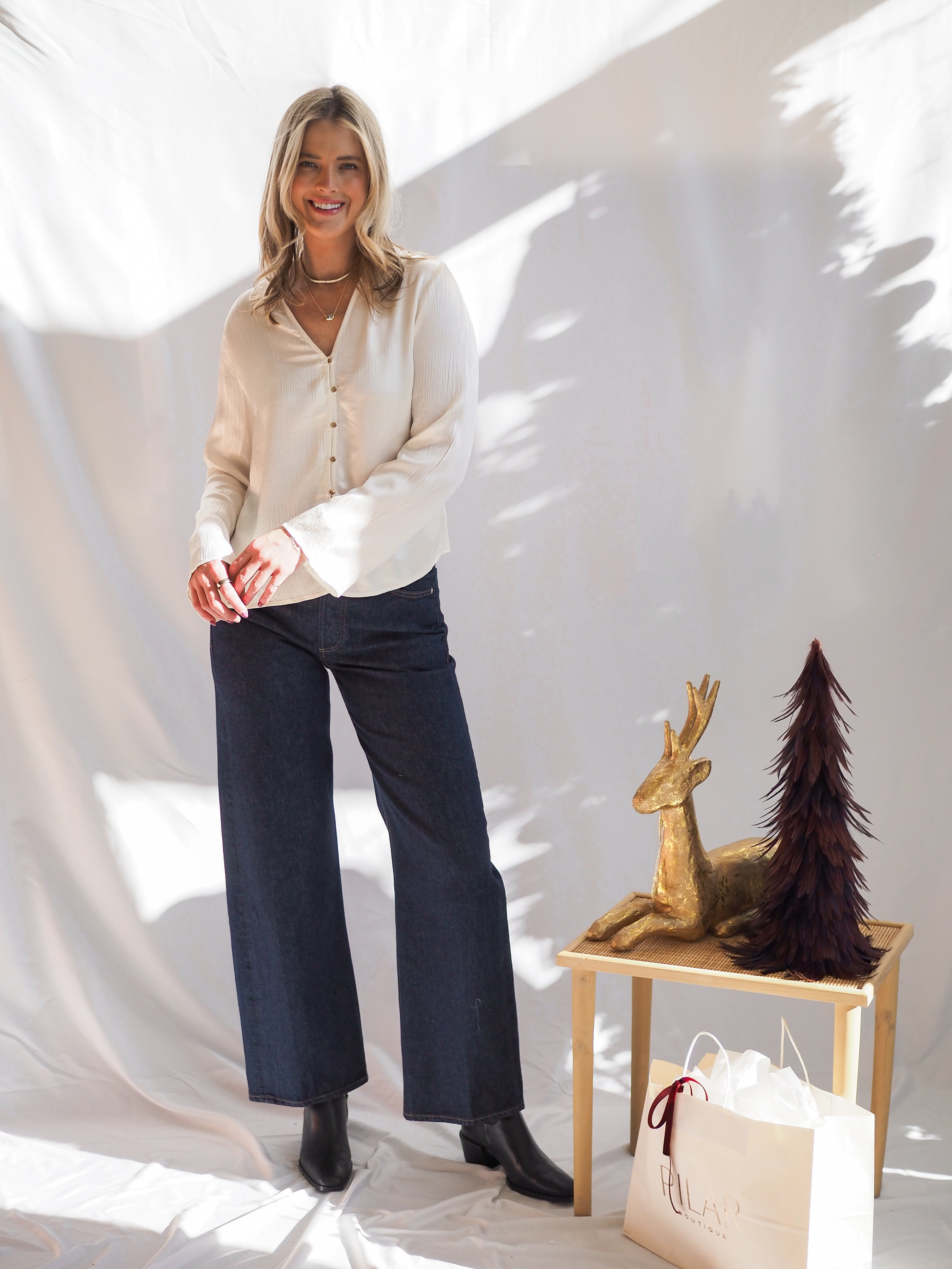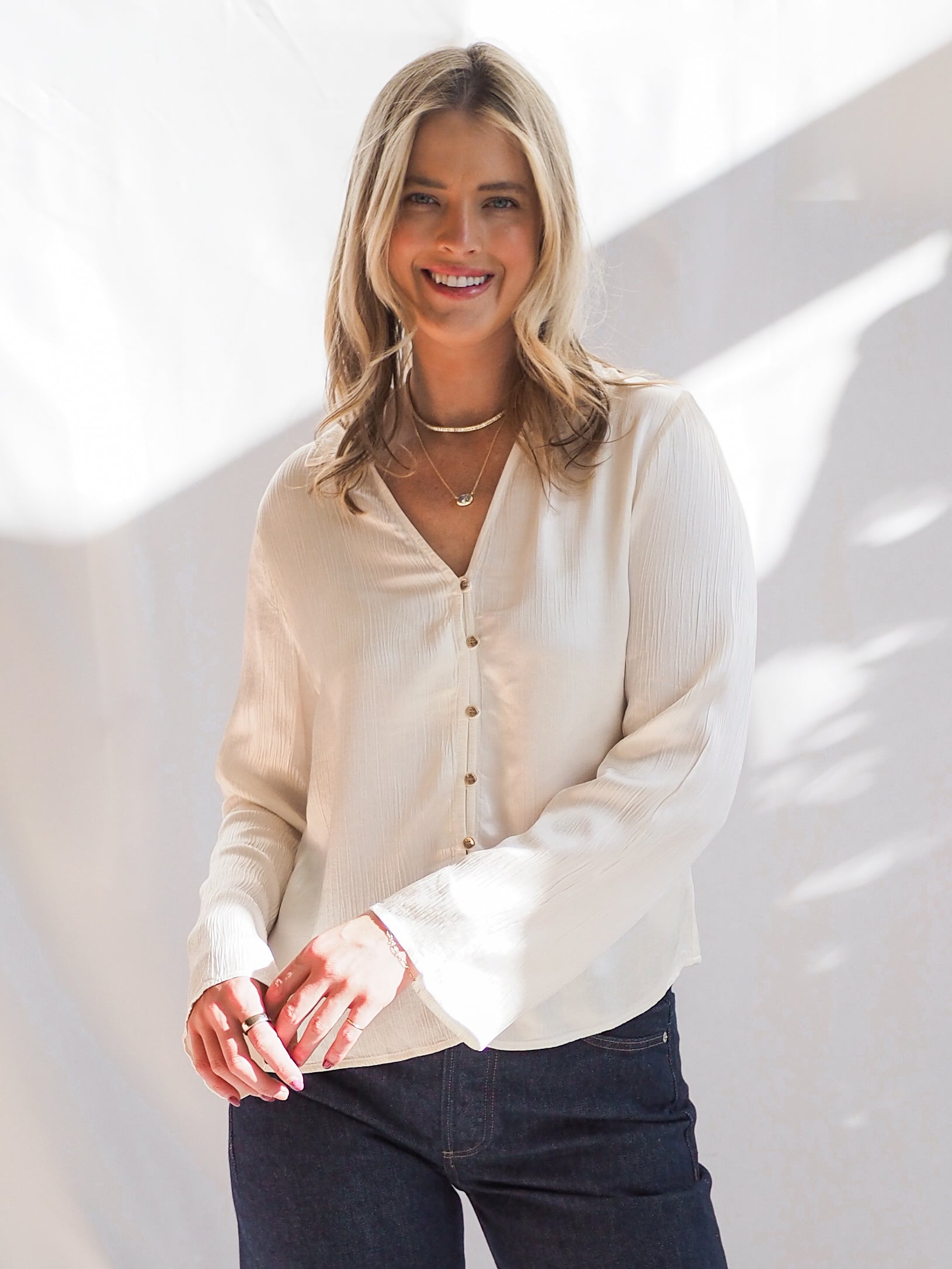 Elegant and timeless, the Bella Dahl Fitted Bell Sleeve Shirt brings a modern twist to a classic silhouette. Designed in soft ivory with a tailored fit and subtle bell sleeves, it’s the perfect piece for elevating your everyday wardrobe. Style it with trousers for the office or denim for a polished, effortless look.