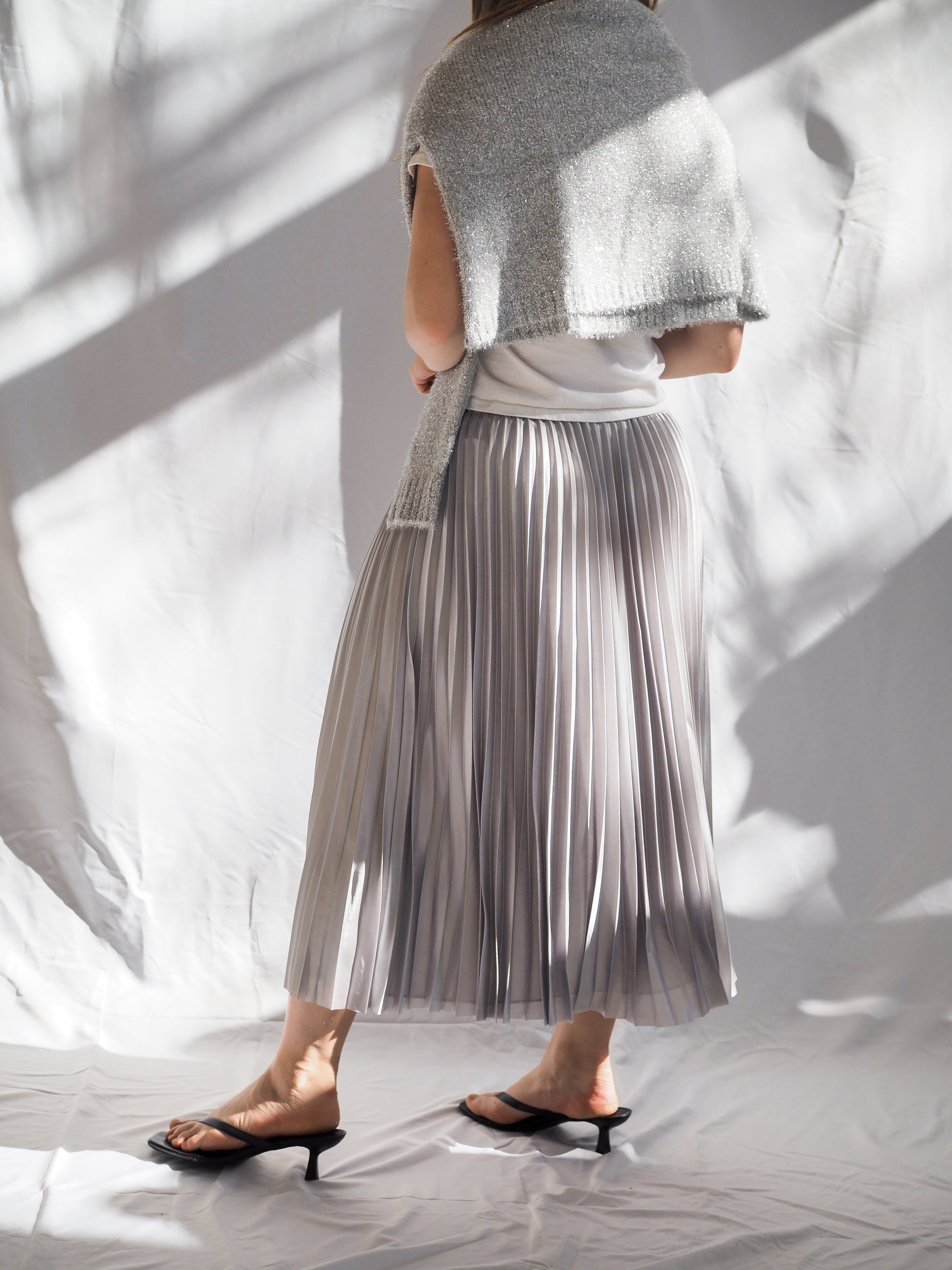 Polished and effortlessly feminine, the Bella Dahl Pleated Midi Skirt in Silver brings a touch of shine to your wardrobe. Crafted from a fluid, satin-like fabric, it features soft pleating that catches the light beautifully with every step. The elastic waistband ensures an easy, comfortable fit, while the midi length keeps the silhouette timeless and versatile. Style it with a cozy knit for day or a sleek blouse and heels for night—it’s the perfect piece for both casual elegance and special occasions.