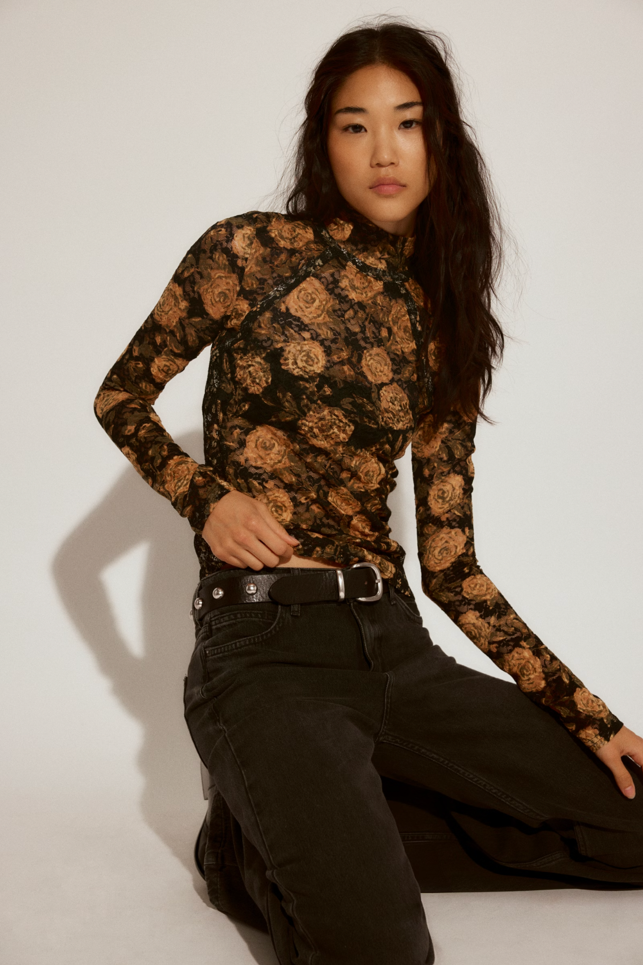 Embrace effortless boho charm with this Free People Lyric Long Sleeve lace top. Its close fit highlights your silhouette while delicate rose blooms add a flirty touch. The turtleneck and long sleeves keep things cozy, and a playful back keyhole with button-and-loop closure adds a hint of intrigue. Perfect for layering and dressing up your everyday style with a whimsical twist.