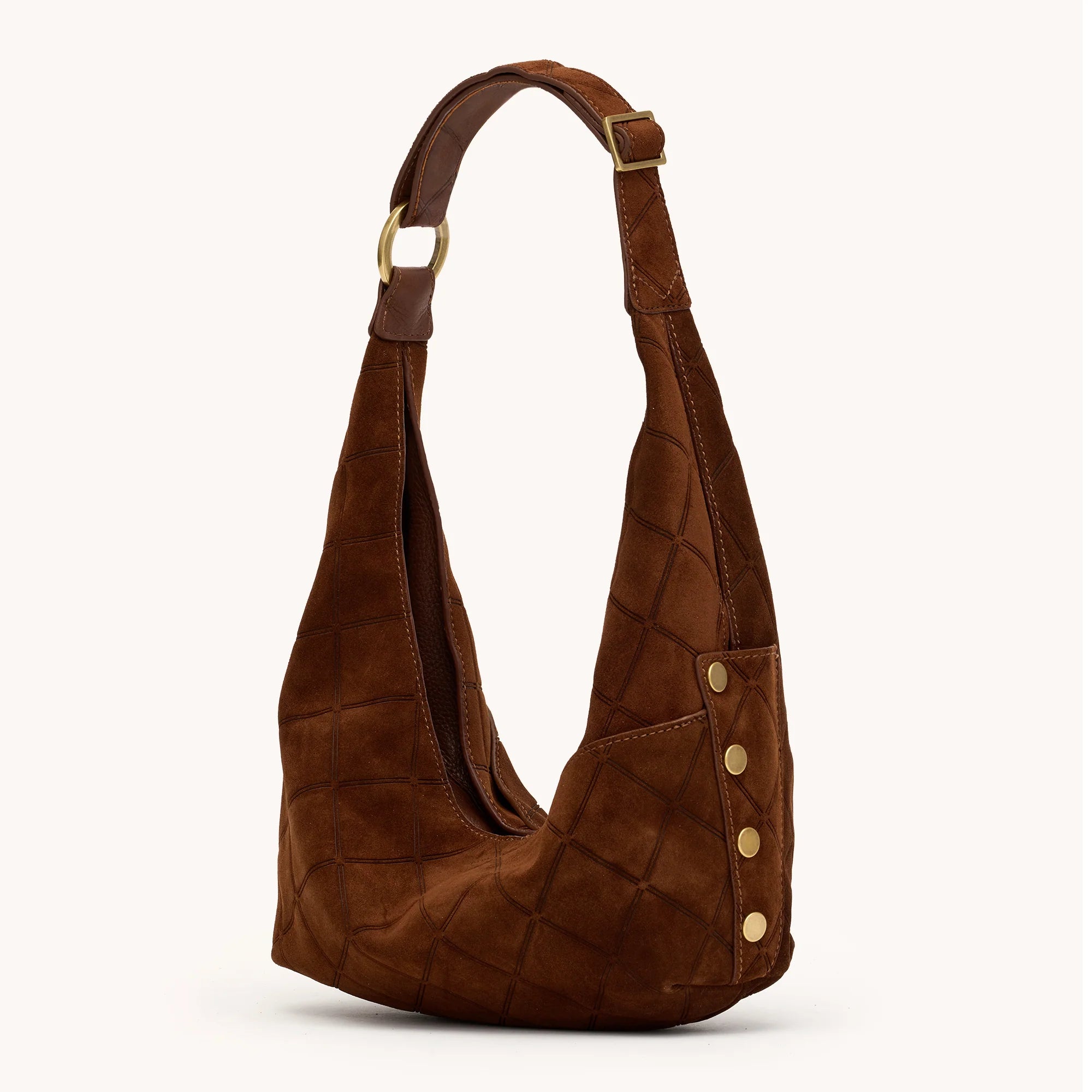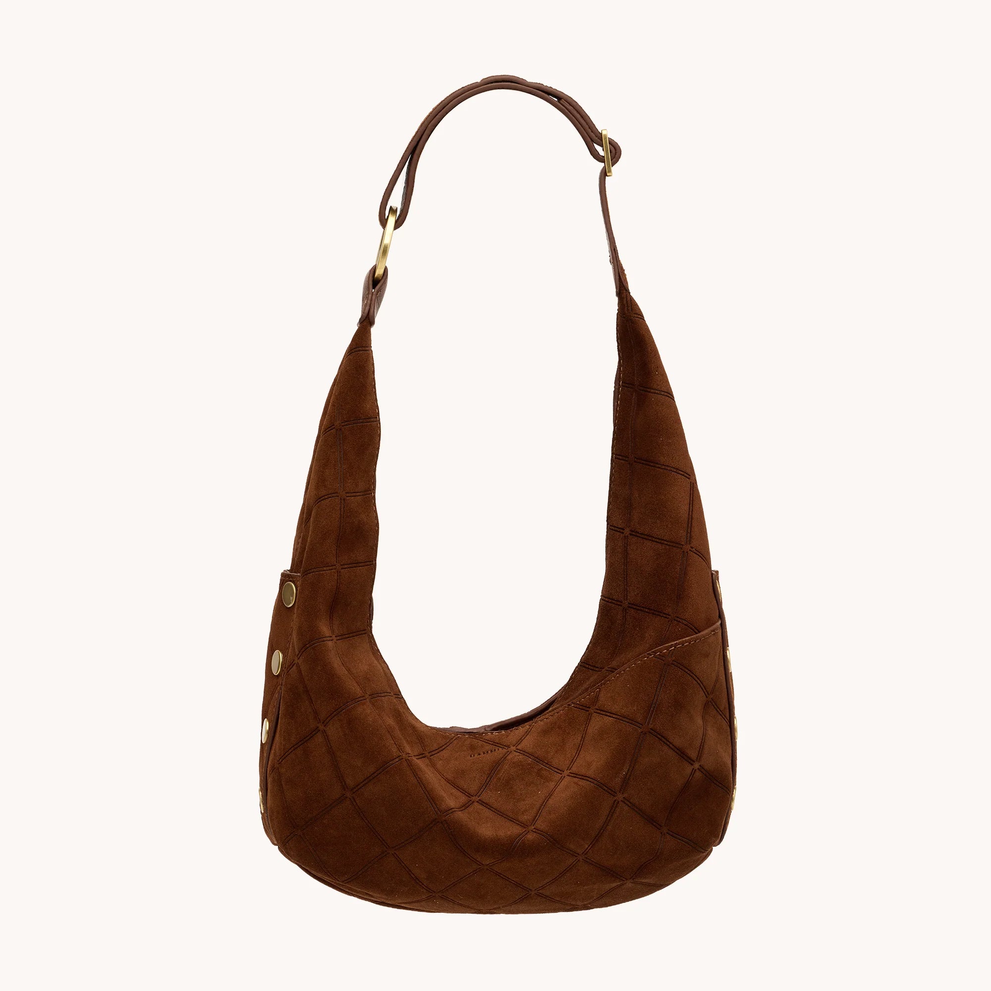 • Crafted with a deep brown Italian suede with a unique doubled diamond embossing effect and deep brown pebble leather accents