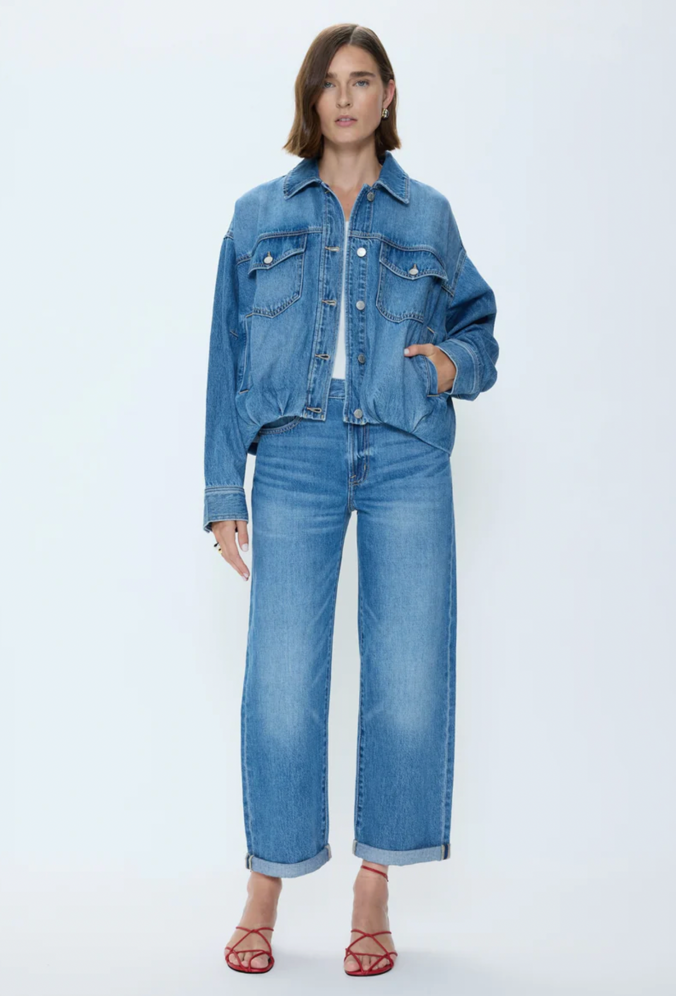 The Bibi Denim Jacket reinterprets the classic denim jacket with a softly structured blouson silhouette. Made from 100% non-stretch cotton, it holds its shape while offering relaxed drape and subtle volume. Designed with dropped shoulders, clean seaming, and a slightly cropped length, it delivers balanced proportions for effortless, modern styling.