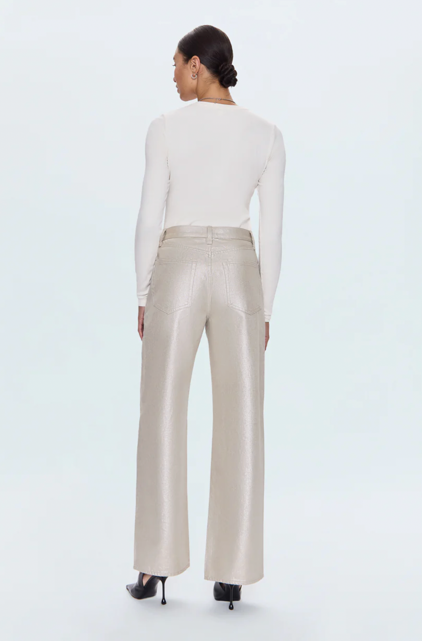 A signature shape, Tate features a high rise, bowed wide leg, and full-length 32" inseam that creates elegant movement and modern proportion. Crafted from 100% cotton non-stretch denim in Champagne Luster, a pearly coated finish that reflects light with every step for an effortlessly elevated look.