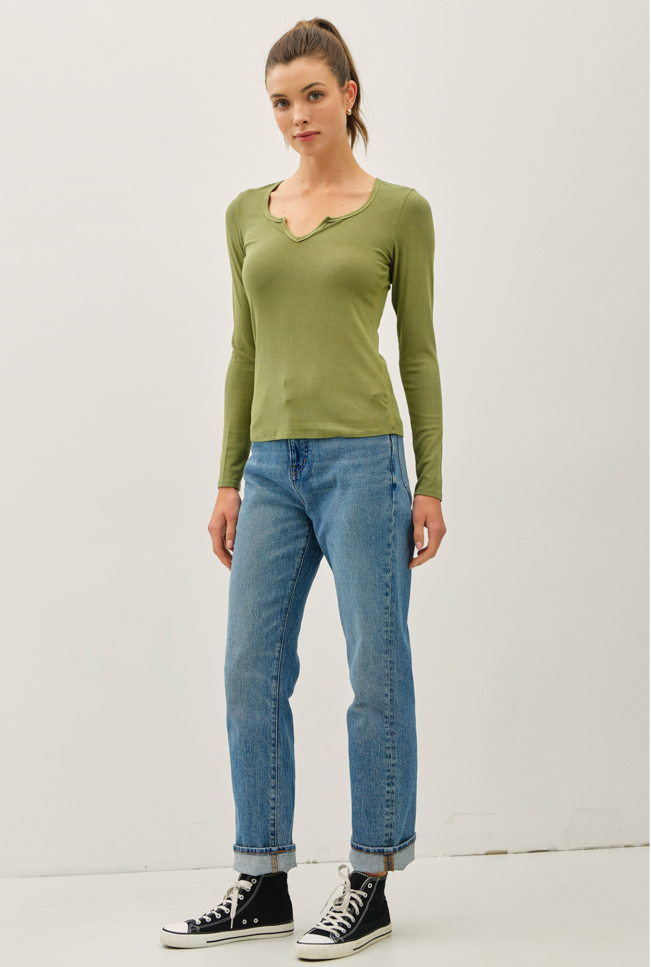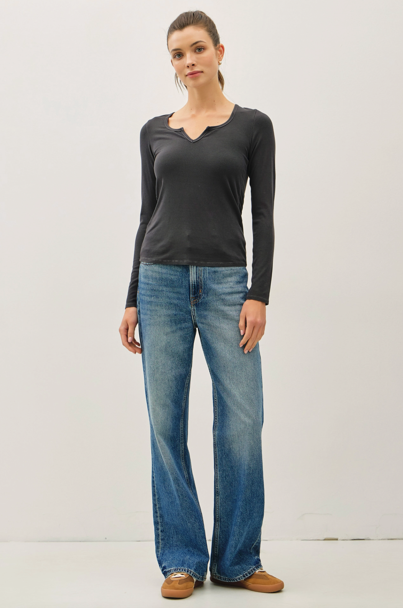 Simple yet elevated, the Ribbed Notched Neck Longsleeve Basic Top is a layering essential you’ll reach for again and again. Designed with a flattering notched neckline and a fitted silhouette, this ribbed top offers just the right amount of stretch for everyday comfort. Perfect on its own or styled under jackets and sweaters, it’s the versatile piece your wardrobe has been waiting for.