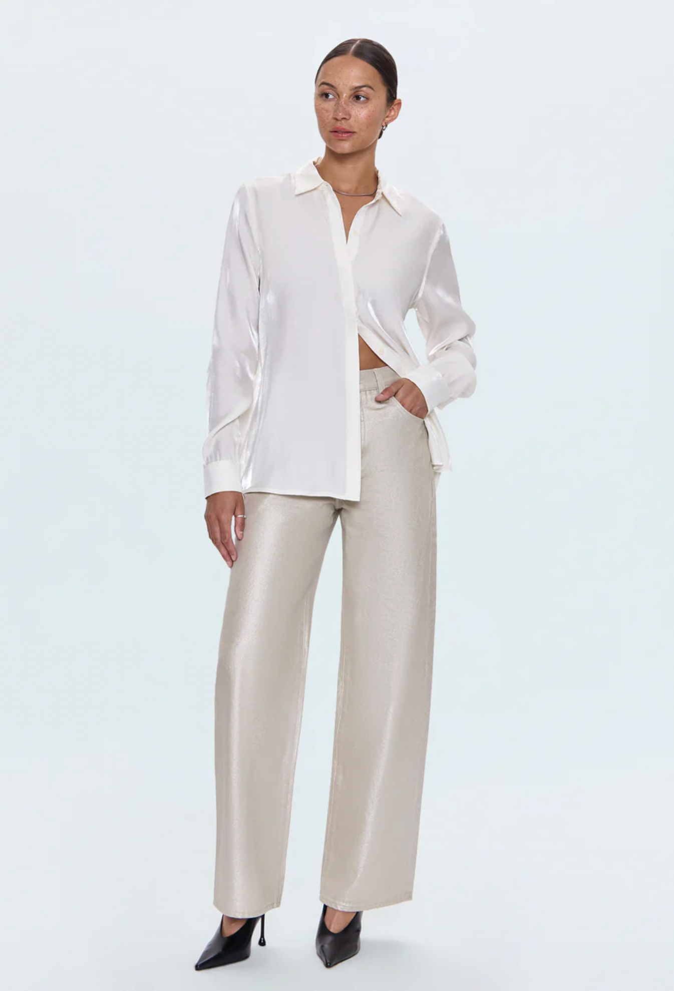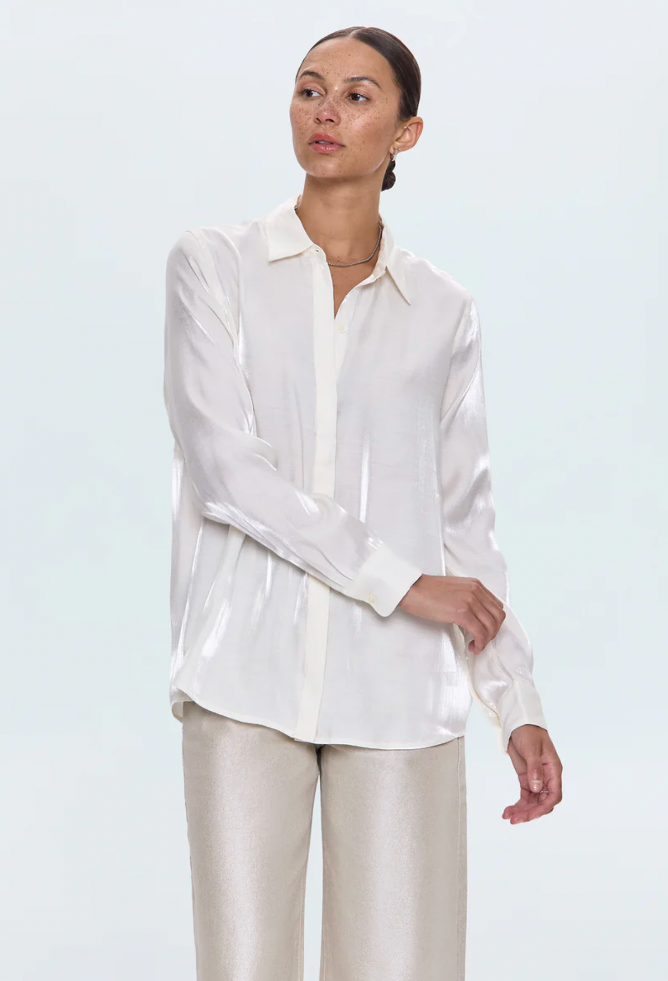 A timeless button-up, Tilda features a relaxed fit and long sleeves that balance soft structure with modern ease. Designed with a pointed collar and subtle sheen for quiet polish. Crafted from a smooth woven blend in Ecru, a clean neutral that transitions seamlessly from day to night.